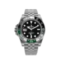 Hands: Mercedes-style hands with an additional green GMT hand for second time zone tracking