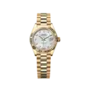 The watch is paired with the iconic President bracelet, introduced in 1956 with the original Day-Date, and later adopted by the Lady-Datejust for its perfect balance of elegance and comfort. With semi-circular three-piece links and a concealed Crownclasp, the bracelet drapes gracefully around the wrist, offering both suppleness and security.