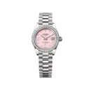 The pink opal dial is crafted from rare decorative stone, each cut and polished to meet Rolex’s exacting standards. Its natural variations ensure every dial is unique. The diamond hour markers and Roman IX set with 8 diamonds add brilliance and sophistication, perfectly complementing the soft hue of the opal.