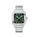 The large 39.8 mm stainless steel case retains the iconic square silhouette and exposed screws that define the Santos line, while the gradient green dial transitions from light to dark, creating a captivating visual effect. Paired with luminous sword-shaped hands and applied Roman numeral hour markers, the dial offers both readability and sophistication.
