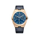 The deep blue sunburst dial showcases superb clarity, with refined subdials displaying the day, date, month, and leap year. The pink gold markers and hands glow subtly with luminescent coating, enhancing readability and adding a modern touch to its classic elegance.